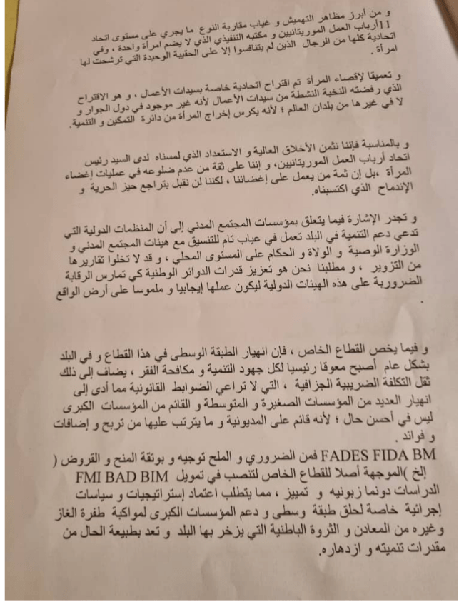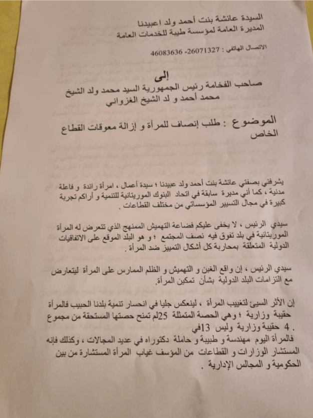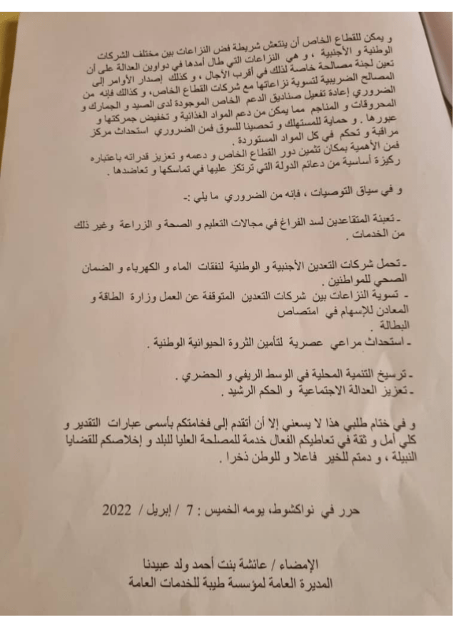 Notons que cette femme courageuse résolument engagée sur les pistes des affaires a remis de main en main une lettre de revendications et de doléances aux président de la république où des informations particulières concernant le patronat mauritanien , la place des femmes en son sein , le comportement et la disponibilité de son président monsieur Zeine Elabidine Ould Cheikh Ahmed , qu’elle juge qu’elle juge disponible attentif et même coopérant ; cette lettre renferme des axes d’orientation soigneusement définis pour des interventions ciblés en faveur des femmes , des PME et le secteur privé de façon générale.